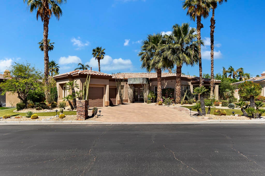 Strategically nestled in the coveted Tierra Vista development in north Palm Desert, this home boasts convenience and luxury. A welcoming paved driveway leads to the two-car garage. Just 10 minutes away, find shopping in Palm Desert and La Quinta, with easy access to Highway 10. Step through the double glass doors into a 2820 sq ft sanctuary, featuring two bedrooms plus a den, all resting on a spacious 13,000 sq ft lot. Revel in the blend of ceramic tile and wood flooring throughout. Upgraded with shutters in the family room, den, and bedrooms. Dual fireplaces add warmth to the family room and living room. The kitchen dazzles with granite counters and a gas stove top. Separate laundry room. Utilize the third bedroom as a den, adorned with exquisite cabinetry. The primary bathroom is a retreat, offering a double vanity, makeup desk, glass block shower, and tub. Enjoy the spaciousness of the primary closet. Step outside to a backyard oasis with a shimmering pool, surrounded by a ceramic and stone deck. An electronic extension overhang provides shade on sunny days. Low-maintenance landscaping enhances both front and back yards, complemented by mature Palm trees. Reasonable HOA dues cover cable/internet. A bonus room off the garage adds versatility to this exceptional property.