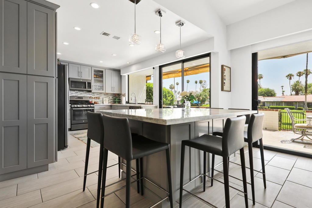 Welcome to your dream home! This beautiful contemporary condo offers an exquisite blend of luxury, comfort, and style. Perfectly situated to capture mountain and golf course views, this tastefully furnished home is ready for you to move in and enjoy the desert life. The condo features sleek finishes, modern fixtures, and an open-concept layout that enhances the living space. Enjoy stainless steel appliances, elegant quartz countertops, quartz center island with pendant lighting & chic cabinetry in the kitchen. New windows and sliders flood the space with natural light, highlighting the contemporary decor and providing a warm, inviting atmosphere. Retreat to your spacious master suite featuring plush bedding, ample closet space, and an elegant bathroom with modern fixtures. Additional bedrooms are equally well-appointed, offering comfort and privacy for family or guests. The back patio features two awnings with morning east exposure and comfortable furniture to enjoy your evening beverages. Located in a sought-after community, this prime location is close to the clubhouse, Omni Resort, and front entrance. You will have access to a range of amenities including a swimming pool, and fitness center. Enjoy convenient proximity to shopping, dining, and entertainment options. Do not miss the opportunity to own this exceptional condo that combines luxury living with golf course & mountain views.
