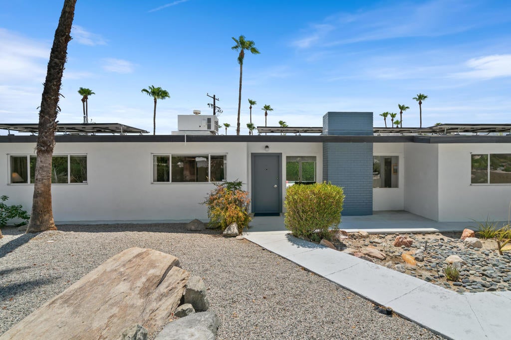 Completely refreshed and ready for its new Mid-century loving owners! Classic Palm Springs pool house on a highly desirable, private 13,500 sq. ft. lot. Built in 1953 and designed by Jack Meiselman, his renowned style is present throughout. The living room is complete with a masonry fireplace, sliding glass doors to the pool, and pitched ceilings. Modern kitchen with stainless steel appliances, fresh paint, stylish backsplash and tile floors, under cabinetry lighting, breakfast nook, and exterior access to the backyard. Spacious Primary bedroom with large walk-in closet, e-suite bathroom, and views of the backyard from a large picture window. Second bedroom boasts sliding glass doors to a private courtyard. Convenient laundry closet and separate linen closet in interior hallway. Water hookups in the formal dining room for ease of adding a wet bar and optional gas hookups in kitchen. Fresh paint throughout living spaces, new landscaping, and recent upgrades make this home ready to enjoy! Save on electric bills with leased solar panels! Enjoy the amazing views of the San Jacinto mountains from your private pool surrounded by mature privacy hedges, grass lawn, and cactus. Spacious lot with potential for an ADU or expansion!Short term rental permits are still available in the neighborhood! Less than a mile to shopping, recreation, private gyms, public library, and much more!This home was claimed to be one the six model homes for the historic ''Palm Lane'' development!