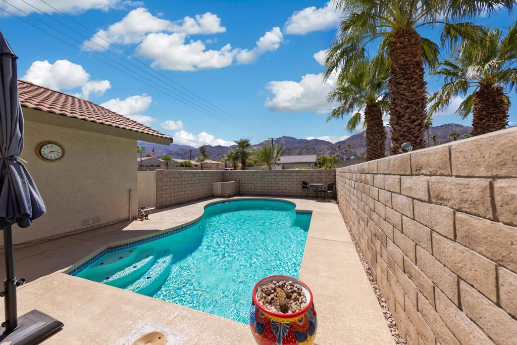 Welcome to the ''Heart Home,'' a charming corner lot residence nestled in the historic La Quinta Cove, surrounded by the stunning Santa Rosa Mountains. Built in 1990, this home offers over 1,600 square feet of living space with semi-vaulted ceilings, recessed lighting, plantation wood shutters, and a cozy fireplace.The kitchen, truly the heart of the home, features quartz countertops, off-white cabinets, and stainless steel appliances, along with convenient bar seating. The semi-open floor plan is complemented by tile flooring throughout, creating a seamless flow between spaces. The living room is perfect for cozying up by the fireplace during cooler months. Each bedroom is generously sized, offering ample closet space, with a walk-in closet in the master bedroom. The front-loaded, sun-drenched pool offers breathtaking panoramic mountain views, perfect for soaking up the desert sun. The side entrance provides an additional seating area, while the open space in the rear yard offers endless possibilities for a garden, play area, or dog run. Recent improvements include fresh interior paint and a newly upgraded HVAC system, new water heater & Tesla charging unit in the garage. This home is conveniently located close to Old Town La Quinta, dining, hiking trails, and more.