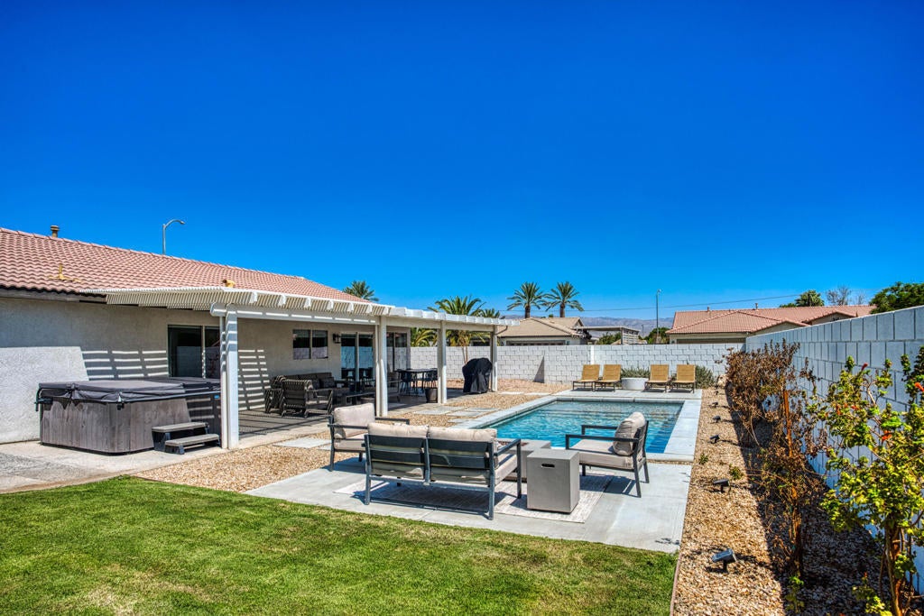 Welcome to this stunning corner lot home that boasts exceptional curb appeal with its beautifully landscaped yard. Go inside to discover a bright and open floorplan, accentuated by vaulted ceilings and an abundance of natural light, creating an inviting and airy atmosphere. The home features stylish laminate plank flooring throughout, enhancing its modern charm. The heart of this home is the gorgeous remodeled kitchen. It features a herringbone-patterned tiled backsplash, quartz counters, a center island perfect for casual dining, floating shelves for added storage, stainless steel appliances, and a convenient pantry. The fully landscaped backyard is an entertainer's dream, offering a covered patio, a hot tub for relaxation, and a sparkling modern salt water pool surrounded by concrete patios ideal for lounging. Gather around the firepit area for cozy evenings, or enjoy the grassy side yard with fenced RV parking--there's space for everyone! Retreat to the primary suite, privately situated on its own side of the hallway, offering a peaceful oasis with an updated bathroom featuring a tiled tub/shower and a modern vanity. The other bathroom has also been thoughtfully updated with stylish tile, marble topped vanity, and new fixtures, ensuring a fresh and contemporary feel throughout. No HOA and Indio is an Airbnb friendly area and this has been an active short term rental, perfect for investment opportunity! Centrally located with shopping and dining options close by!