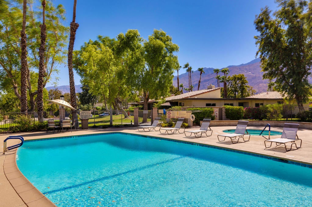 Experience the pinnacle of Central Palm Springs living in this exquisitely remodeled corner end-unit (PREMIUM) where elegance + comfort converge. This SOUTH FACING (lighter during season) 2BD/2BA oasis has been meticulously transformed, from baseboards to gleaming light fixtures. Savor the modern kitchen w/ fresh cabinets, quartz countertops, and a raised ceiling that enhances the bright, open ambiance. The redesigned entrance optimizes space, accommodating a fridge without sacrificing style. Both baths are luxuriously updated w/ cabinets, counters, toilets, tiles, + a tub in the 2nd bath, merging convenience + sophistication. Abundant natural light pours through the double-paned + clerestory windows, creating a tranquil retreat. Window coverings, including blackout shades in the bedrooms, ensure serene mornings. This unit's PREMIUM location offers stunning Mtn. views from both patios, the living room, + bedrooms, setting it apart in the complex. 2 expansive, separate patios provide the perfect setting for alfresco dining or simply soaking in the breathtaking surroundings + south views. 1-car garage w/ a new door tops off an extensive list of upgrades. Enjoy easy access to amenities, including pools/spas, tennis/pickleball courts, all set within the lush, manicured landscapes that define Sunrise Racquet Club. You OWN the land. A short distance to downtown, parks, gym, shopping, restaurants, bars, and DAP, this remodeled gem truly embodies the vibrant Palm Springs lifestyle.