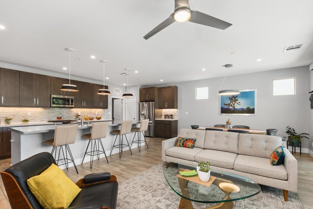 This Stunning Connect plan is Meticulously kept and features three bedrooms, two baths plus a den/office. This floorplan lives large with an open concept floorplan that features an inviting kitchen with a spacious island, quartz countertops, custom design tiled backsplash, designer cabinetry, LED kitchen island pendant, chef kitchen with stainless steel top-of-the-line appliances, gas range with hood, built-in microwave, large sink and don't forget the spacious pantry. The large family room and dining room boast a wall of sliding glass doors and custom electric window covering. The serene primary suite with custom window coverings, Ceiling fans, and tranquil lighting to set a nice mood plus an en-suite bathroom featuring a large upgraded tiled walk-in shower with bench, upgraded shower doors, double vanity with gorgeous lighting above the custom mirror, large walk-in closet. The serene backyard gets a lot of sun, landscaped and designed beautifully with a sitting area fountain and total privacy. The owner has many upgrades, Call for a private showing. Polo Club amenities include Tennis/pickleball courts, a Fitness Center, a Resort Pool & Lap Pool, a Poker/Billiard Room, a Golf Simulator, a Restaurant /Bar, and more. This home represents the Trilogy Lifestyle. Call Michael today for your private showing.