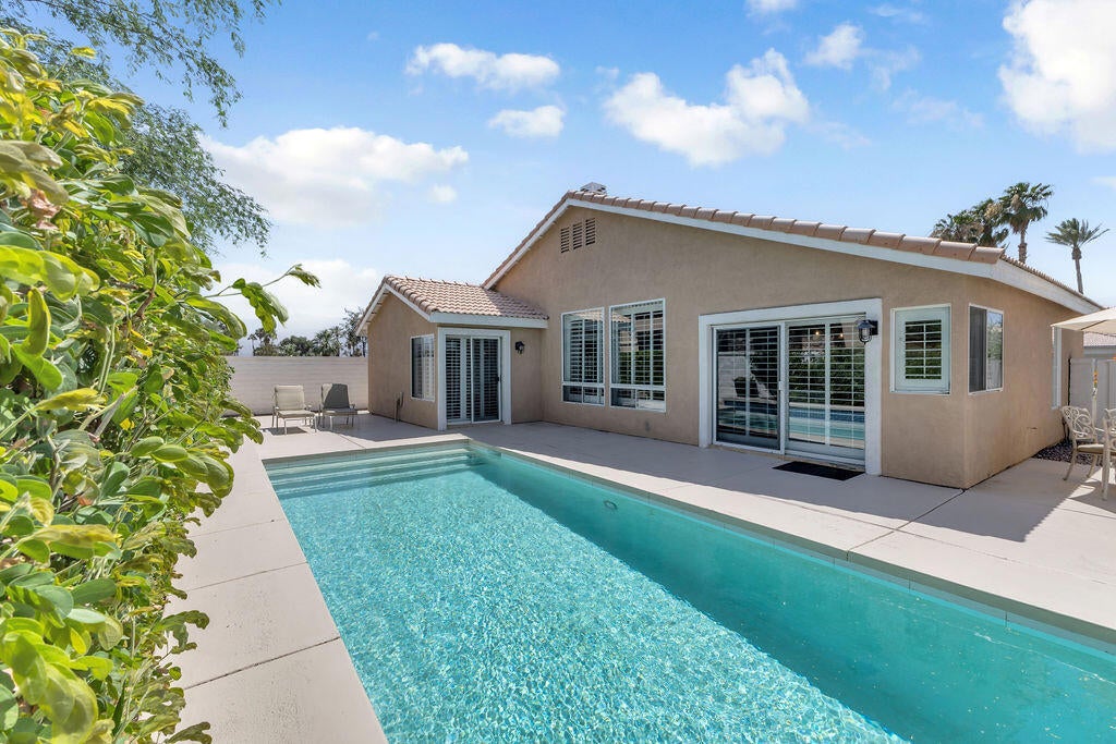 Come enjoy the mountain views from the front courtyard of this beautiful Palm Desert home in the Merano community. Located in a quiet cul de sac, you are free to enjoy the traffic free streets. This home is equipped with PAID solar that was installed in 2023 and a water softener. Other upgrades include tile floors, new tile in the pool, and a custom kitchen island. When you enter the living room you are met with vaulted ceilings and a cozy fireplace. The living room is open to the kitchen which offers a friendly place for a family and friends gathering.