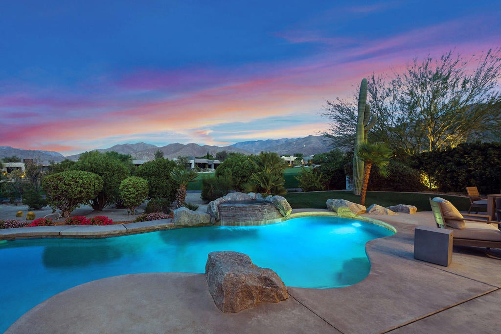 Freshly remodeled contemporary on BIGHORN's 13th fairway with open floorplan, high ceilings, 4 bedrooms and 4 full baths plus 1/2 bath, including detached guest house.Multi-purpose den/office with French doors leading to the entry courtyard; adjacent to kitchen, with views and direct access to entry courtyard.Master Suite includes marble fireplace, television, and sliding glass doors to private patio; master bath features a soaking spa tub, large shower, dual vanities and makeup area, walk-in closet, private lav and extensive natural light.The detached guest house with private entry through courtyard features a fireplace, morning bar, television and built-in cabinetry; a full-appointed bath including dual vanity, walk-in closet and private lav.The lushly landscaped entertainment patio overlooks the fairway on the Mountains 13th hole, with pool and spa, fireplace, cascading water feature, built-in barbecue center, conversational seating and dining area.Additional features include two-car garage plus golf cart, and convenient proximity to Club amenities.