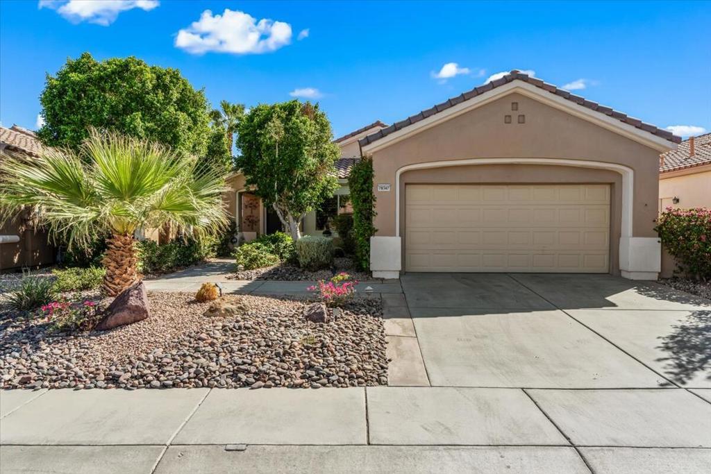Sun City Palm Desert - Barbados. This beautifully maintained home is ideally situated between the Sunset View and Lake View clubhouses. The expansive south-facing backyard features an extended patio with an Alumawood cover, perfect for enjoying the outdoors. The elevated rear yard offers added privacy and open views of the stunning south and west-facing mountains. Enhanced hardscaping and lush desert landscaping create excellent curb appeal. Inside, elegant chiseled-edge tile with mosaic accents runs throughout, except for the master bedroom. Plantation Shutters adorn the windows throughout the home. The living room includes a custom-built media center and recessed lighting. In the kitchen, you'll find slab granite countertops with rounded edges, a breakfast bar, recessed lighting, and cabinets with convenient pullout shelves. The master suite offers a spacious walk-in closet, while the master bath includes dual sinks and a stall shower. The laundry room is conveniently located indoors, and the roomy garage offers additional storage racks. .