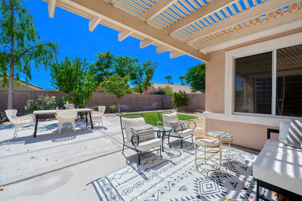 This inviting expanded Lanai model in Sun City Palm Desert boasts peak-a-boo Mountain Views, a spacious and luminous layout, complete with custom shutters and ceiling fans.Step inside to be greeted by the light and bright Living Room that flows seamlessly to the Dining Area and Kitchen. Two Bedrooms, each with its own bath, offer a retreat at opposite ends of the home, ensuring utmost privacy. The primary Bedroom features a convenient walk-in closet, while a separate Laundry Room includes a washer and dryer for added convenience. The Kitchen is equipped with ample counter space, a refrigerator, gas stove, dishwasher, and microwave. The generous garage easily accommodates two cars and features built-in custom storage cabinets for organization. Outside, gorgeous trees and a tranquil Outdoor Patio, shaded by a pergola-style roof offers a variety of entertainment options.Sun City residents enjoy a wealth of amenities such as a Gated and Guarded Entry with 24-hour patrol, two 18-hole Golf Courses, three Clubhouses, on-site services like a Post Office and Business Center, multiple dining options, Fitness Centers with Pools and Hot Tubs, diverse Groups and Clubs, Dog Parks, scenic pathways, and sports facilities including Tennis and Pickleball Courts. Nearby attractions include upscale shopping destinations, entertainment venues, and the exciting Acrisure Arena for sports and concerts. Experience the best of resort-style living in this Sun City.