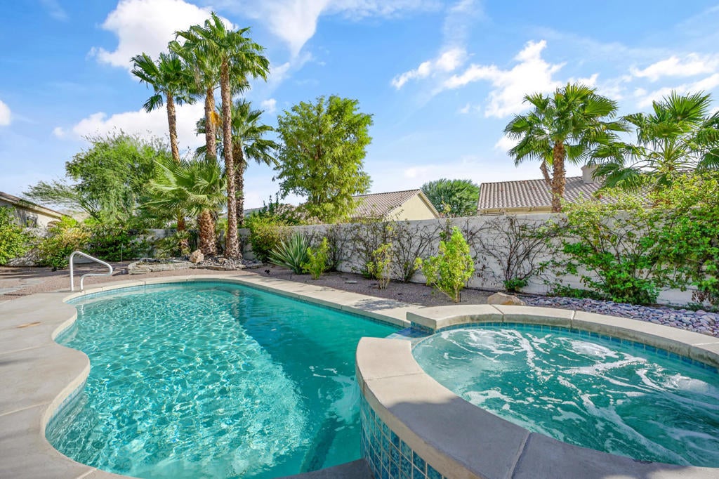 This spacious San Benito model with an oversized lot in Sun City Shadow Hills offers 2 bedrooms, 2 bathrooms, and a versatile den/office + hobby room that can be enclosed with a door, creating the potential for up to 4 sleeping areas. The great room is highlighted by tile flooring, a cozy fireplace, and large windows surrounding the sliding door, allowing for expansive views of the beautifully landscaped backyard. The kitchen is designed with wooden cabinets, granite countertops, & a functional layout that opens to the main living area, making it perfect for both everyday living & entertaining. The interior was repainted about a year & a half ago, the garage was repainted last month, the refrigerator and dishwasher are only a few months old, and the AC motor, valves & freon were all replaced about a year ago. The master suite is a private retreat featuring a large window that welcomes natural light, along with a spacious master bathroom equipped with dual vanities, a tub, and a separate shower. The front and backyards are thoughtfully designed with greenery, rocks, and a sparkling pool and spa, providing a serene outdoor space. Sun City Shadow Hills residents enjoy a range of community amenities, including two 18-hole golf courses, indoor and outdoor pools, fully equipped gyms, clubhouses, restaurants, and banquet facilities, all designed to foster an active & social lifestyle. Whether seeking relaxation or recreation, this property offers the best of desert living.