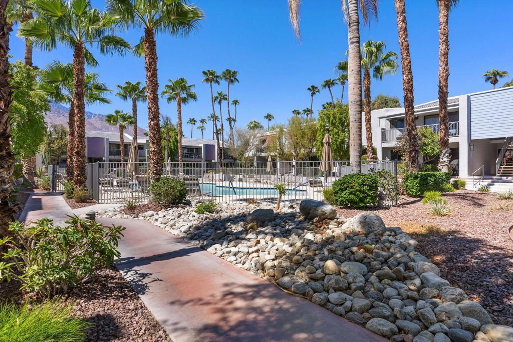 Nestled in the sought-after south end of Palm Springs, Palm Villas is a gated community featuring spacious pools & spas, tennis, 4 pickle-ball courts and BBQ areas, all surrounded by lush, mature landscaping and vibrant citrus trees. This upper unit boasts 2 bedrooms and 2 baths complemented by vaulted ceilings and clearstory windows that fill the space, light and bright throughout the day. Enjoy the ample morning sun exposure and picturesque treetop views alongside a generous living area seamlessly connected to the dining space and kitchen. The bedrooms offer breathtaking mountain views, perfect for watching stunning sunsets in bed. Situated on Fee Land (you own it) with low HOA fees covering water and trash, Palm Villas is an ideal oasis for embracing the desert lifestyle. If you seek tranquility and spaciousness, this condo is your perfect retreat and may also be available furnished. A fantastic opportunity to make this your home and step into the real estate scene!