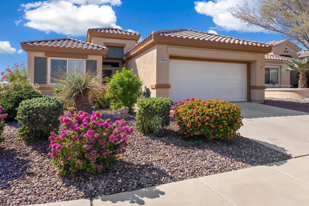 Enter thru the front courtyard and welcome to one of the most desirable floor plans ... The St Maarten with office/ den that has custom builtins ...two desk areas Open floor plan ... great room with tile flooring ...kitchen with breakfast bar. There are 2 bedrooms ... Separated for added privacy. The primary suite has a large closet and views to the yard. Utility room with washer and dryer has direct access to the two car garage with builtin cabinets for added storage. Plantation Shutters on all windows. Lovely landscaped rear yard with views of the mountains ...