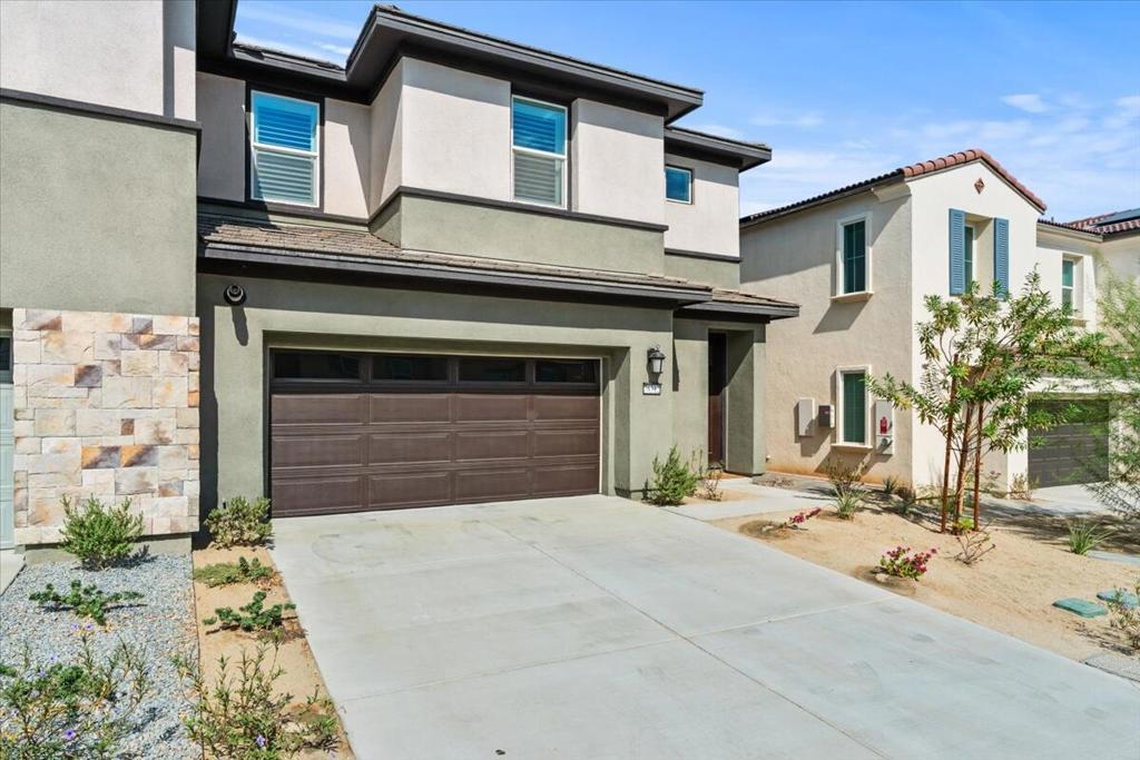 Don't miss out on this almost new home built in 2023. Situated in Palm Desert this three-bedroom, two-and-a-half bathroom home boasts paid off solar, plank tile flooring on the lower level, plantation shutters, cutting edge appliances, and a smart thermostat. With no shared walls, a loft area upstairs and an oversized 2 car garage, you'll have no worries while enjoying the beautiful desert evenings in your new backyard that includes, low maintenance year round greenery with turf and colorful drought tolerant shrubs. This home is in a prime sought after location, near numerous eateries and premier shopping, plus it's only a three minute drive to the new Acrisure Arena! In a quiet community that offers a recreation center, sparkling pool, bbq's, and a fire pit, You Don't want to miss out on this 1 year new gem!