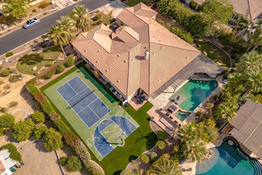 Welcome to your own private resort. Resting on over half of an acre, this spectacular 4100 ft. estate feature four bedrooms, five bathrooms, an office plus a den and a very open floor plan. Relax in the resort style pool with swim up bar after exercising on the professional length pickle ball court or half-court basketball hoop with NBA rated glass backboard. Outdoor entertaining space also features an inviting sunken fire pit with ample seating, extended covered patio, outdoor kitchen & a lush citrus garden just beyond the RV parking at side of the home. Just beyond the courtyard entrance, is this grand and open floor plan with very spacious living area off the kitchen plus a formal dining room and den. High ceilings throughout! 4 bedrooms include a master suite with walk in closet plus an en suite casita. 4 Car Garage. The Desert River Estates community is located off 49th and Jefferson. It is a short walk to the polo grounds, home of Coachella Fest, Stagecoach & many more venues. It is a gated & private enclave of estate homes on large lots. This property has one of the largest lots in the community. Call me today for a private showing or additional details.