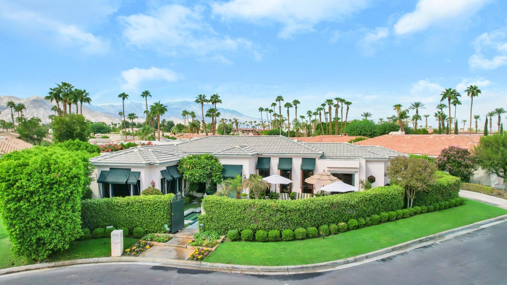 Indulge in the allure of a French flair ambiance in you custom-built, steel framed home oasis, in the prestigious gated community of The Cove at Indian Wells. A serene entrance through the gated courtyard, adorned with a glass tile bridge over the pool, leads you to an majestic front door. Inside, the grandeur continues with tall windows and high ceilings that fill with light the formal living room with fireplace, dining room and offer captivating mountain views. For comfort, luxury and privacy, all 4 on-suite bedrooms open to private patios with the primary bedroom accessing the spa. The large casita enjoys a separate entrance. The gourmet kitchen is a culinary paradise, featuring a center island, seating bar and breakfast room that adjoins the family room. Ideal for hosting and entertaining guests. Next to the kitchen is a convenient service area with large cabinets, refrigerator and laundry center. Step outside and enjoy the colorful landscaping, pool and spa and of course that view. Energy efficient solar panels, low HOA dues, freshly painted interior, new carpeting, new epoxy floors in both garages and the close proximity to essential amenities.