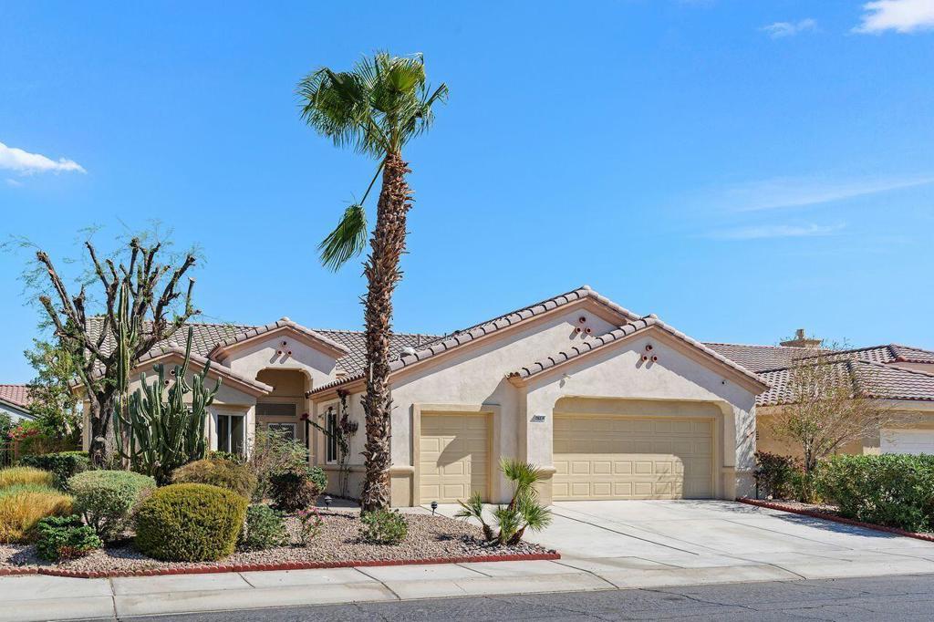 This freshly painted popular St. Croix model floor plan is located in Sun City Palm Desert, an upscale guard gated active adult community. This 2-bedroom, 2-bathroom home has over 2,000 square feet of living space, including a large den and a hobby room. The great room has soaring ceilings that create an airy, expansive atmosphere, inviting you to unwind and entertain with ease. The bright open kitchen, with breakfast bar, has granite slab counter tops with an attractive backsplash. The large primary bedroom suite includes a large walk-in closet. The primary bathroom includes a remodeled shower. The mature north facing backyard features a covered patio and is perfect for outdoor entertaining. This home also includes a two car garage plus a golf cart garage. The golf cart garage include a mini split air conditioner and was used as an art studio.