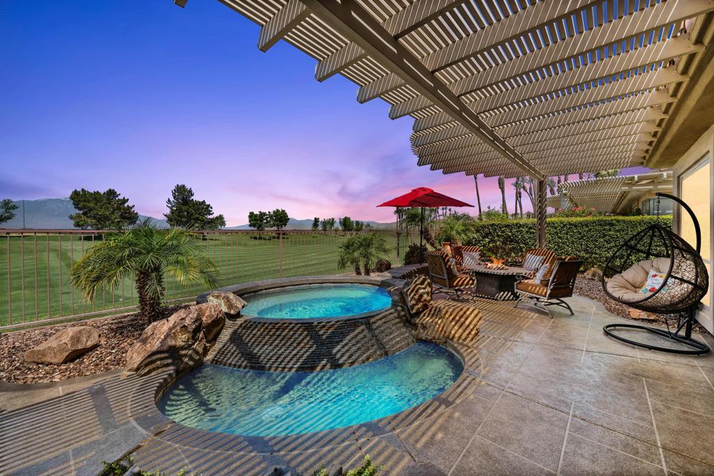 Tons of Terrific Upgrades! A Must See! 2,907 sf GREAT ROOM EXTENDED PORTOFINO, 3 Bed/4 Bath highlights BREATHTAKING 180-degree GOLF COURSE & MOUNTAIN VIEWS on an ELEVATED LOT overlooking San Gorgonio's 12th hole in Sun City Palm Desert. Stunning CURB APPEAL includes STONE siding on home & gated courtyard columns. Pristine landscape lures you to the GORGEOUS DOUBLE DOORS. Be immediately WOW'd by a wall of glass that brings the outside in. Foyer boasts 12-ft ceiling w/transom window. CROWN MOLDING & MILGARD 'LOW-E' WINDOWS throughout. Great Room spotlights custom wood cabinets & dramatic stacked stone fireplace. Octagon-shaped 11-ft triple crown ceiling graces dining room. Gourmet kitchen features QUARTZITE countertops, TRAVERTINE BACKSPLASH, island, newer appliances, pullouts, pantry & SEAMLESS CORNER WINDOW. Primary bedroom w/slider showcases exceptional VIEWS, plantation shutters, ensuite bath w/dual sinks, walk-in shower & spa-like soaking tub. Both REMODELED GUEST ENSUITE BEDROOMS are on opposite sides of the home. Large RETREAT set-up as office accents built-in cabinets/desk. Indoor-outdoor living experience continues to the backyard w/COVERED PATIO, ROCK WATERFALL SPA, bubbling fountain & built-in BBQ. Two-car + golf cart EPOXY floor GARAGE has abundant storage & 3-TON A/C split unit. An extensive list of additional upgrades, including 35-panel SOLAR system, truly a WELL-MAINTAINED home! A GEM w/spectacular VIEWS offers an inviting resort-like lifestyle just for you!