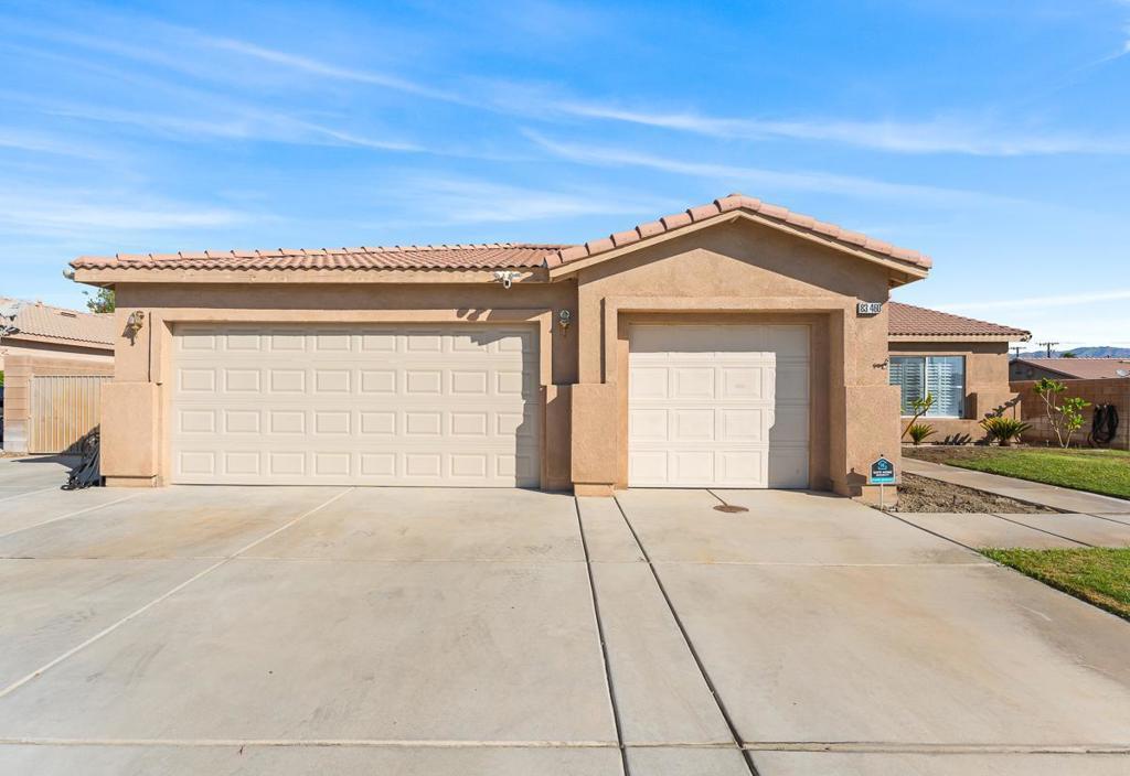 Welcome to Villa Montego, a highly desirable community located in the heart of Indio, just minutes from the world-famous Coachella and Stagecoach Festivals! Situated on a quiet cul-de-sac, this spacious 2,194 sq. ft. home offers 4 bedrooms and 2 bathrooms, making it an ideal choice for first-time buyers, long-term investment, or as a lucrative Airbnb rental with no HOA fees. Step into the formal living and dining areas, where soaring vaulted ceilings and new wooden shutters add elegance and charm to the space. The home features brand new laminate wood flooring throughout, creating a modern and cohesive look in every room. The great room is perfect for entertaining, with an open flow to the newly remodeled modern kitchen, allowing you to cook and socialize effortlessly. The family room showcases a stylish decorative accent wall and an electric decorative fireplace, adding warmth and ambiance to your gatherings. The versatile fourth bedroom can be transformed into a cozy den or office, with stylish double accordion doors for added flexibility.The primary suite is a private retreat, featuring its own decorative accent wall, as well as a large walk-in closet, soaking tub, a separate stand-up shower, and dual sinks for convenience. The 3-car garage is a standout feature with epoxy floors flooring, modern lighting, fresh paint, and built-in storage cabinets--offering both functionality and style. Additionally, the property offers covered RV parking, perfect for storing yo