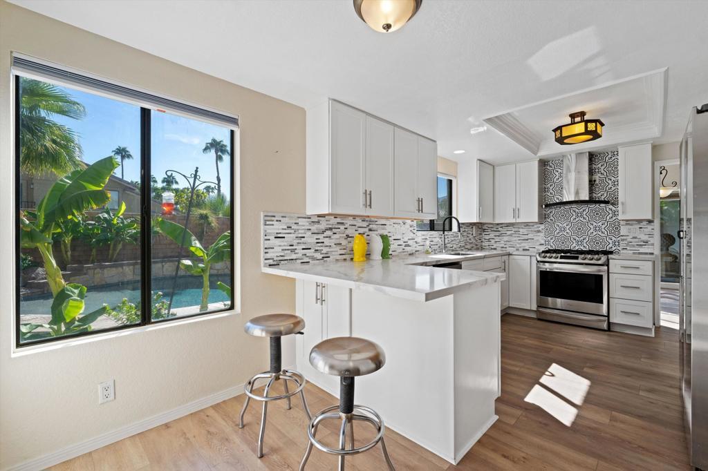 Welcome to the centrally located, family-oriented neighborhood of Parc La Quinta! With 3 bedrooms and 3 baths with a Family Room downstairs, the primary bed room has a large attached room which can serve as a nursery, office or home gym some have converted to additional bedroom. Upgraded flooring, Bathrooms and Kitchen makes this home move in ready. . Well-appointed kitchen features modern Quartz counter tops, stainless appliances countertops and a beautiful Mountain view! .As you explore the home, you'll discover a spacious living area that seamlessly connects to the outdoor oasis. The backyard allows for indoor outdoor living and entertaining. You can enjoy a pool with cascading risen spa, 2 firepits large backyard with mountain views!