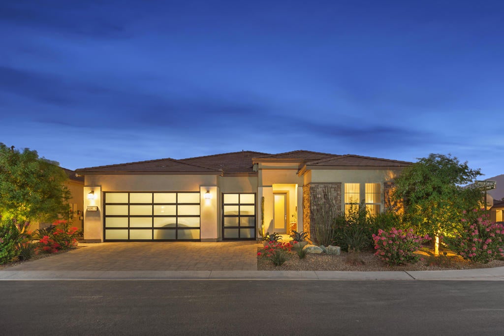 Welcome to this highly upgraded Liberty Model boasting 3-bedroom plus den, 3.5-bath home offering a perfect blend of luxury and comfort in over 2,367 sf. Step into an open-concept living space with high ceilings and abundant natural light. This home shows like a model home with many upgrades throughout including custom quartz fireplace, California Closets built-ins, extended garage, tesla charger, Sonos sound system, leased solar, tankless water heater. and much more. The gourmet kitchen features GE Cafe appliances, a large island and elegant finishes, making it a chef's dream. The spacious primary suite includes a walk-in closet and a spa-like bathroom. This home sits on a premium south facing corner lot with mountain views, overlooking a beautiful greenbelt with your own private oasis with a pebble tech saltwater pool, custom lighting and water feature, with glass tile and limestone pavers and coping. Enjoy indoor-outdoor living with a covered patio, misters & heaters and a beautifully landscaped backyard, perfect for entertaining or relaxing. Guard-Gated 55+ Community with Low HOA. Too many upgrades to list! This is a must-see home. This home comes with an Optional Club Membership transfer fee of $1,875. Club amenities include: tennis/pickleball courts, fitness center, resort/lap pools, poker/billiards room, restaurant/bar, and artisan & culinary studios plus a beautiful clubhouse. Resort living at its finest!