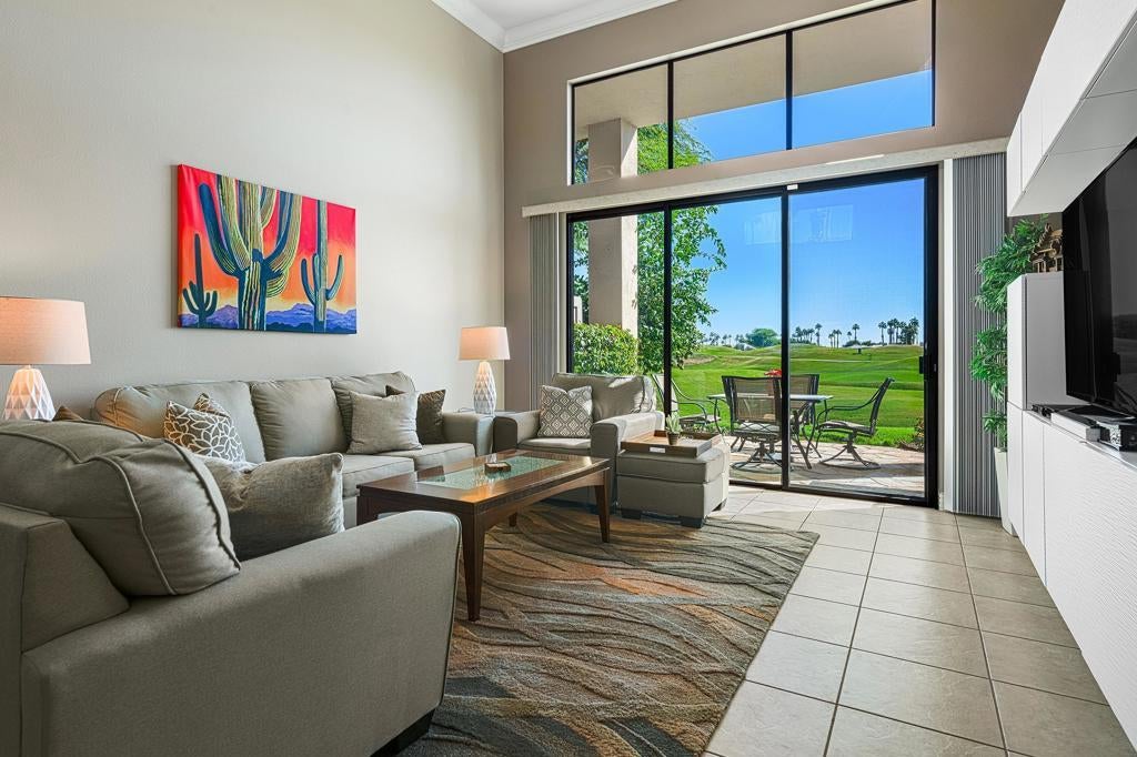 Beautifully updated Champion One on the 12th hole of the renowned Pete Dye Stadium Golf Course at PGA West. Custom features include, upgraded cabinetry in kitchen and baths, soaring ceilings with crown molding, window coverings, paint and baseboards. Clear ECO tinted windows, recirculating hot water pump system and finished garage with epoxy floors. HOA covers heated pools/spas, cable/internet, 24 hour guard gated security, landscape & more. Multiple outdoor entertaining areas for the perfect Desert Retreat .PGA West offers several membership plans to accommodate your interest in this prestigious club. This is the perfect full time or lock and leave vacation retreat. Home is being sold Turnkey Furnished.