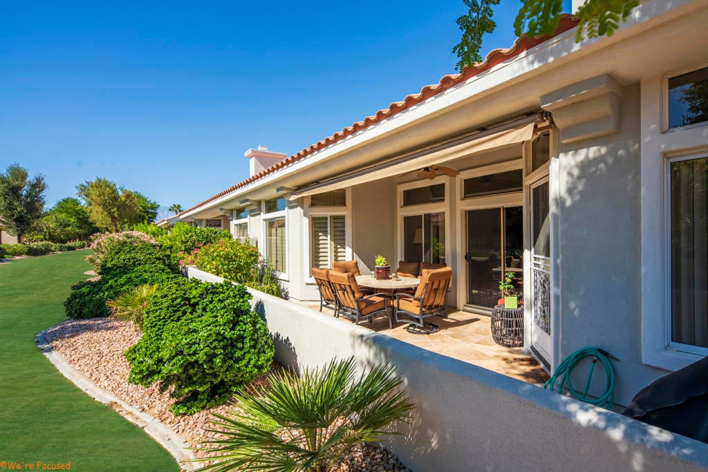 Welcome to this attractive home in the prestigious Sun City Palm Desert, the ultimate active adult community! This rare Amethyst floorplan is in a maintained area, offering a unique opportunity for ownership. Whether you're a seasonal resident or planning to stay year-round, enjoy worry-free living with the HOA managing landscaping, exterior paint and roof maintenance. This elegant attached home features an inviting layout with travertine tile in the main areas, hardwood floors in the living and dining spaces, and plush carpet in the bedrooms. A stamped concrete walkway leads to a beautiful leaded glass entry door, welcoming natural light.The main living areas flow seamlessly and include a see-through fire & ice-style fireplace, overlooking a private back patio with stamped concrete and a remote-controlled awning--ideal for enjoying drinks while taking in south-facing views of the greenbelt. The kitchen boasts mostly newer stainless-steel appliances (2022), painted cupboard fronts, chic hardware, and a tiled backsplash creating a fresh look. Excellent separation of bedrooms. The primary suite overlooks the greenbelt and features shutters, walk-in closet, dual vanities, separate shower & tub and a skylight for plenty of natural light. Guest bedroom is located in the front and near the guest bathroom. Additional features include a dedicated laundry room and a two-car garage. Furniture and a golf cart are available for purchase outside of escrow. Don't miss this opportunity!