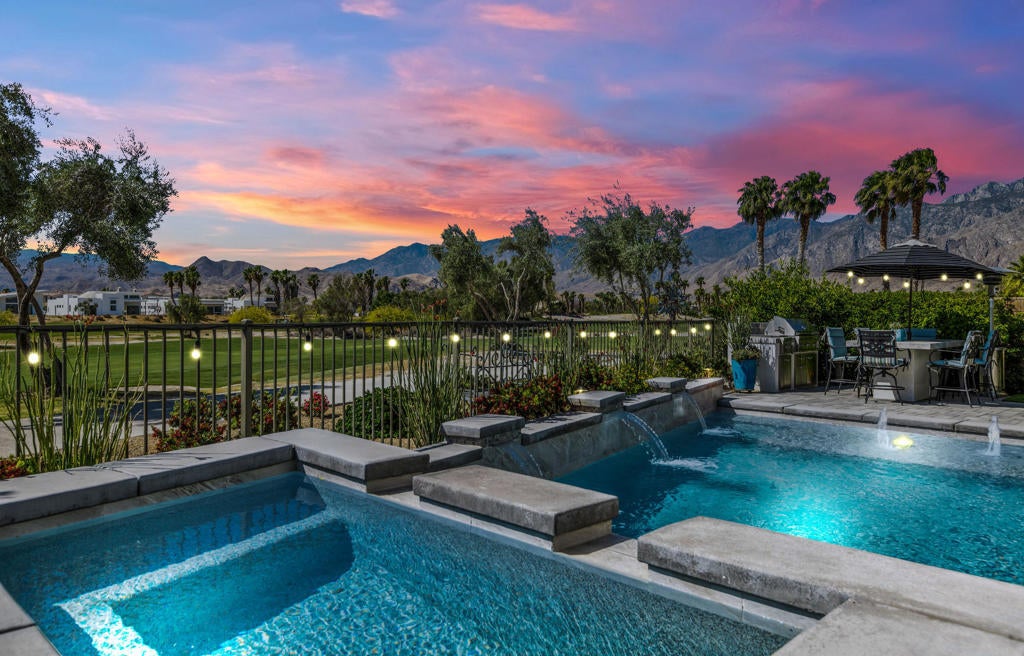 Discover Rich Contemporary Elegance with VAST SOUTHERN MOUNTAIN and GOLF COURSE VIEWS, in ESCENA , Palm Springs. Enter into a grand open Great Room with 9 FT accordion glass doors, that open to the patio offering loads of natural light; Take note of the designer inspired colorations and finishes including wood flooring /tile flooring throughout, custom motorized blinds and window treatments in main living areas; premium lighting and fixtures, completed by a chic dining area and wet bar with ample seating for your guests. The perfect setting for Entertaining! A special Bonus is the FLEX ROOM used as an office or 4th Bedroom, with a built in Murphy Bed and doors for privacy. Delight in a true Chef's Kitchen with custom walk-in pantry, Viking gas cooktop, and double ovens, prime cabinetry and lavish marble counters/backsplash and quartz island! Boasting a luxurious Primary Suite and bathroom with double vanities, shower AND tub, completed by a professionally appointed closet with dressing area. A secondary ensuite and third bedroom provide comfort with style. Efficiency Here, with a Tankless Hot Water Heater and Leased Solar Panels! SAVOR spectacular Desert Living with pool/spa & fountains, pavers front/ back, desertscape, built in BBQ /table and alfresco style dining, all overlooking the 4th Fairway! Escena, known for the Nicklaus Design Golf Course, Low HOAs, Bark Park and Scenic grounds offers a vibe sure to Please! Come enjoy this home with OVER $200,000 in Upgrades;
