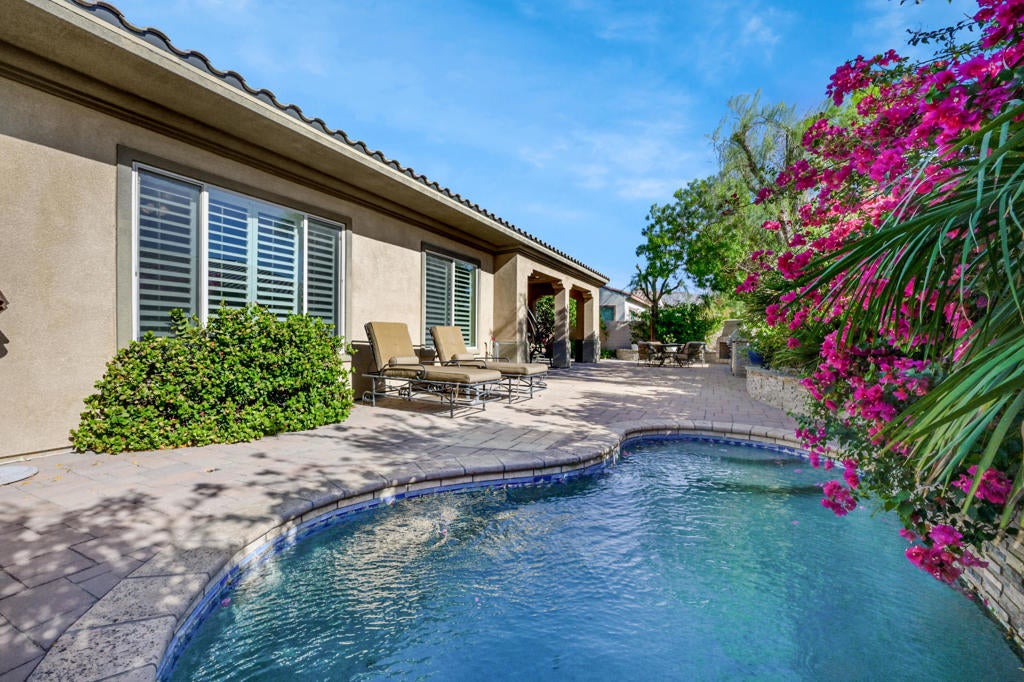 Welcome to this stunning Sorrano model in the highly sought-after Sun City Shadow Hills, a vibrant 55+ community filled with resort-style amenities! This beautiful 3 bed/3 bath + den home spans approx. 2,112 sq. ft. and includes a detached casita, perfect for guests or a private retreat. Enter through the elegant Iron Gate into a spacious tiled courtyard featuring a Pergola that connects the casita to the main home. Inside, enjoy the luxury of 10 ft ceilings, crown molding, and window shutters. The gourmet kitchen boasts granite countertops, a large island, 42-inch cabinets with pull-out shelves, stainless steel appliances, and a double oven. The primary suite is a relaxing haven, with a spa-like bathroom featuring a double vanity, tile step-in shower, and a custom walk-in closet. Step outside to your resort-style backyard with a saltwater spool, stone fireplace, BBQ grill, refrigerator, and beautiful paver patio. The garage includes storage units, a desk, epoxy floors, and an evaporative cooler. All of this is just a short walk to the Santa Rosa Clubhouse where you can enjoy golf, bocce ball, pickleball, tennis, fitness facilities, indoor & outdoor pools and much more!