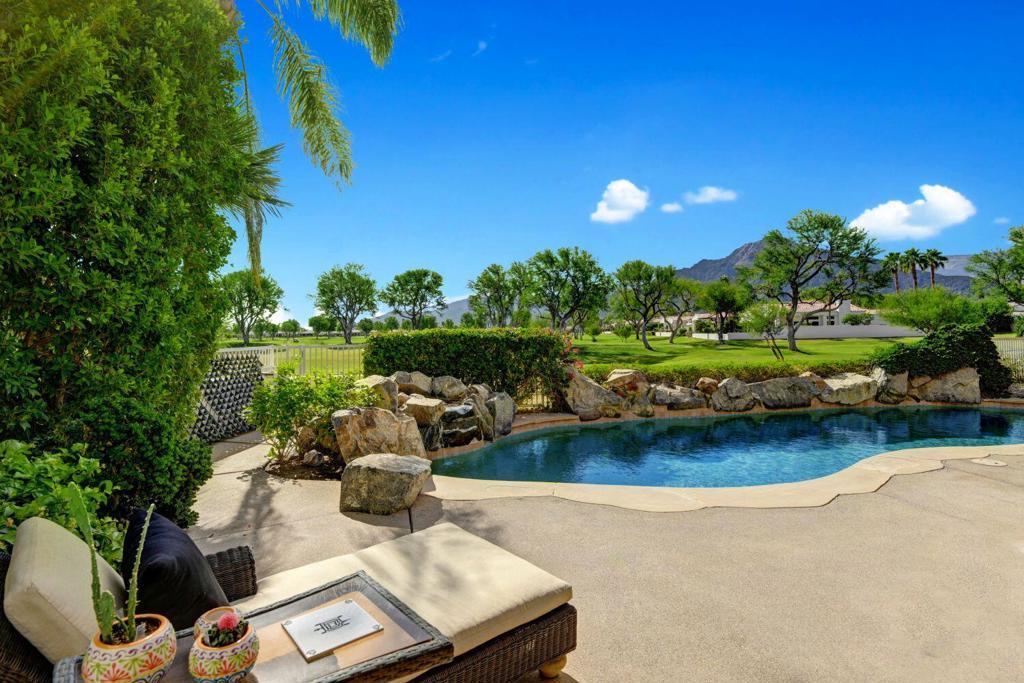An unbelievable opportunity in The Citrus to own a home in a special location with breathtaking southern mtn. views on the 9th fairway of the private Citrus course. This single family attached unit has a patio area that houses a custom pool/spa with a wrap around grassy side yard offering even more outdoor sitting vignettes & a built in BBQ. Enjoying the Desert lifestyle never has never been better. Inside the home was totally upgraded approximately 6 years ago and then again a new total upgrade 2 years ago. The following are some of these upgrades: starting with a gourmet kitchen with new appliances and counter tops,, travertine floors through out, new carpeting in the master bedroom, a totally redesigned stone fireplace, new lighting and chandeliers in most rooms,, new window treatments, all newly updated bar area, all new door levers, and even a brand new roof. The landscaping was totally redone to include new LED lighting. The furnishings, including area rugs & Chandeliers, are all new and hardly been used and are included in the price.So much has been done to the home that we have a comprehensive list that can be provided upon request. This is a true value at The CIttus. Come see for yourself.
