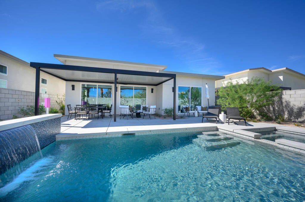 NEW CONSTRUCTION! This new modern single-level home boasts a low-maintenance layout with an inviting open layout consisting of the kitchen and Great Room. Off the foyer is a bedroom with an en-suite bathroom, and two additional bedrooms are tucked away to the side of the home, including the luxe owner's suite with an en-suite bathroom and walk-in closet. The private backyard includes patio cover, pool & spa! Miralon is a unique 309-Acre residential masterplan that blends modern living with the natural beauty of the Palm Springs desert landscape, offering a unique backdrop of mountain views and year-round sunshine. It is a collection of spaces that come together to create peace and energy, including an Amenity Center, three dog parks, u-pick gardens, over seven miles of walking trails, thousands of olive trees and 97-acres of open space. Vitality at Miralon offers five modern floorplan designs ranging from 1,841 - 2,937 square feet, with 3 - 4 bedrooms, 2 - 3.5 bathrooms and 2-bay garages. Homes include spacious indoor-outdoor living with sparkling private pools, spa and covered patios. Located in Palm Springs, a renowned resort city known for its hot springs, stylish hotels, golf courses and vibrant art scene. The community offers easy access to the I-10 and is situated at Indian Canyon Dr. and Sunrise Pkwy off the Hwy 111 corridor. Miralon is a short 10-minute drive to downtown Palm Springs.