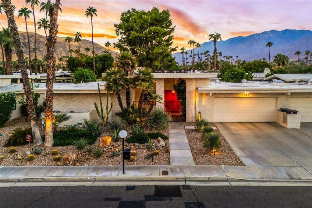 Discover the luxury of living in great architecture! Designed by Charles E Du Bois and built by Roy Fey in 1976, this beautiful home gives you the desert lifestyle you're dreaming of. Grand double doors and formal entryway lead to a spacious great room with tall ceilings and a sunken bar - perfect for entertaining! A wall of glass and clerestory windows bring in the sunshine and mountain views! The home has a fully-owned 28 panel solar system and new terrazzo tile flooring, yet retains the charm of original details including the unique and beautiful combed stucco wall treatment! All rooms are generously proportioned and allow you to stretch out and live comfortably. The den, with its floor-to-ceiling fireplace, can be configured as a media room, home office or a third bedroom. The only shared wall with the neighbor is along the garage and laundry room. In every other respect, this home lives and feels like a standalone home, with windows on all four sides to maximize light and air. Primary bedroom, living room, and eat-in kitchen all have sliders for direct access to the rear patio and the expansive greenbelt. Canyon Vista Estates is a community of just 26 homes, 2 pools, and tennis court, just minutes to shops and restaurants.Come see this spectacular home today!
