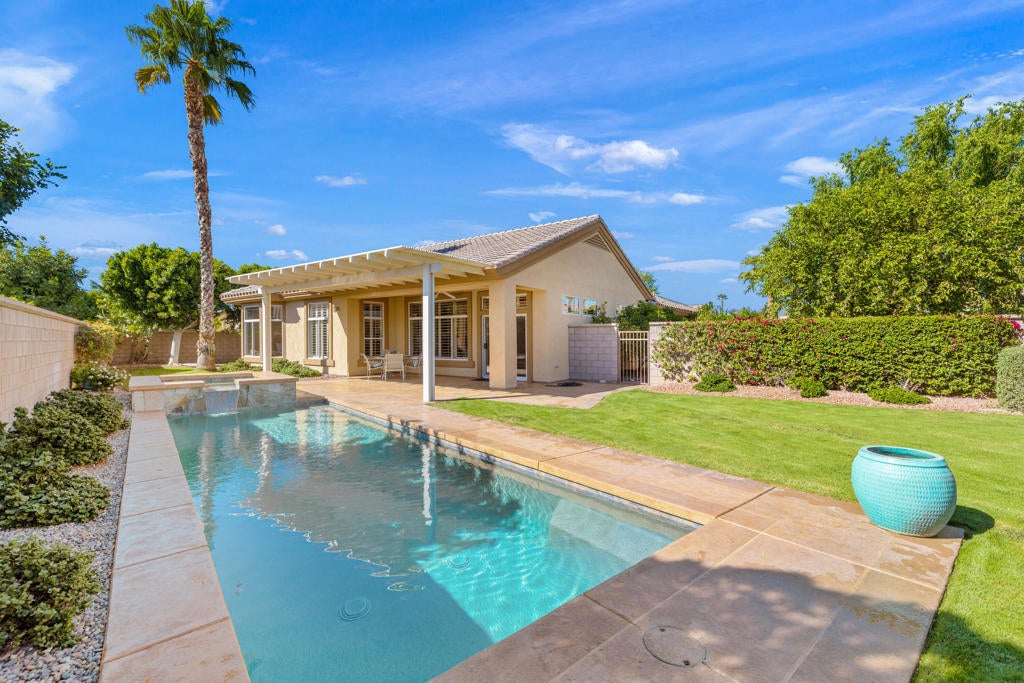 55+ Sun City Palm Desert. Super popular Morocco model on spacious south-facing pie-shaped privacy lot with sparkling salt water, pebble-tec POOL/SPA and waterfall. Excellent location between the Sunset View and Lake View Clubhouses. Nice curb appeal, newer exterior paint, custom overlay, gated front courtyard, leaded glass front door. Inside, 2 beds. 2 baths plus DEN/OFFICE, 10 ft. ceilings, transom windows for a light and bright home, brand new carpet, 18 inch tile, paint is in soft desert-tones, ceiling fans, plantation shutters. Kitchen is open to dining room, has slab countertops, newer stainless appliances and sink, center island, breakfast nook. Living room has built-in entertainment center, Den/office has custom built-in cabinets. The master suite has a bay window and large walk-in closet with custom organizing system. A pocket door leads to the bathroom, with double vanity, stall shower with glass enclosure, Guest bedroom has mirrored closet doors and bath has tub/shower combo. Laundry room has storage closet and washer and dryer included. Garage is extended with golf cart nook space, side access door, cabinets/storage. A/C is approx. 5 years old. Hot water heater and garage opener approx. 3 years old. Now for the BEST part...the oversized patio with POOL/SPA and waterfall (approx. 10 years old), custom overlay, large Alumawood awning, real grass, large side yard with grapefruit, Meyers Lemon,orange trees. Perfect home for entertaining or just relaxing by the pool.