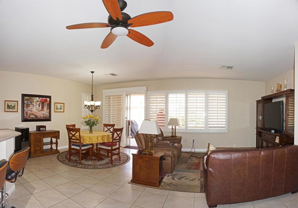 Popular ST. MAARTEN Model In A Great Location Convenient To All 3 Clubhouses. Located On A Quiet Oversized Interior Corner Lot W/ Mountain Views, This Great Room Plan Is Light & Airy W/ Neutral Colors & An Open Look & Feel. Features Include Custom Paint; Upgraded Custom Tile Flooring In Entry, Halls, Kitchen, Living Room, Den, And Bathrooms; Upgraded Carpet In Bedrooms; Upgraded Cabinets In Kitchen, Baths, Hall And Laundry; Custom Plantation Shutters; Electronic Air Filter; 6-Panel Doors; Ceiling Fans; And Cultured Marble Shower Surrounds And Counters In Both Bathrooms. The Island Kitchen Has Corian Counters And Breakfast Bar, Maple Cabinets, Upgraded Appliances, & Water Purification System. Private Backyard W/ An Entertainment-Sized Patio Incl. A Covered Patio Area, Low Maintenance Mature Landscape, An Extended Driveway, New A/C Unit & Added walkway to the rear yard.