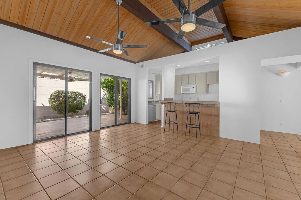 Open House is cancelled for 1/4/25. Small Mountain #13 in Rancho Mirage is a really nice comfy single level Condo with a very cheery disposition! Open concept, vaulted beamed ceilings, a chalet vibe with clerestory window, quietly tucked in the back near the Small Mountain- with a private patio and lovely mountain view. Has a new Trane HVAC heat pump system too!Detached 2 car garage, HOA has 2 pools and Spas, Tennis courts, and nice green areas to walk Bowzer! Super walkable Rancho Mirage location to a coffee shop, eateries, hiking trails and green belt!