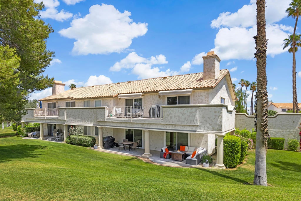 THE BEST OF RESORT LIVING located on the '13th Hole' this Beautifully TURNKEY FURNISHED Upgraded, Meticulously Maintained 3bedroom/2.5 bath with newly remodeled kitchen, boasting granite slab countertops, Quality Cabinetry, Stainless Appliances, Gas Range and a cozy light bright kitchen nook with 3 bay windows and plantation shutters. The large living room is complete with fireplace and upgraded glass slider doors leading out to a long back patio on the golf course. Flooring throughout is a neutral palette, with hallways leading to bedrooms on either side of the condo, with a half bath and laundry room in between Bedroom ensuites and upgraded bathrooms. This fabulously upgraded with property with NEW windows, its multitude of upgrades is move-in ready for you to begin enjoying the Resort Lifestyle with Tennis, Pickleball, Fitness Center, 29+ Pools & Spas, ALL included in your HOA Dues as well as Cable, Wi-Fi, Building, Grounds and Roof maintenance, 24hr Guarded Gate, and Roving Security! Desert Falls Country Club has it all! The 18-hole Scottish Links Championship Golf Course is pay as you play or choose to purchase a membership. Centrally located mid-valley, within walking distance to shops, restaurants, and mere minutes' drive to Acrisure Arena & El Paseo. This Uniquely Upgraded Condo is not to be missed! **HOME WARRANTY IS PAID THROUGH 3/2027. HIGHLY SUCCESSFUL 5 STAR RENTAL** RENTAL HISTORY AVAILABLE**