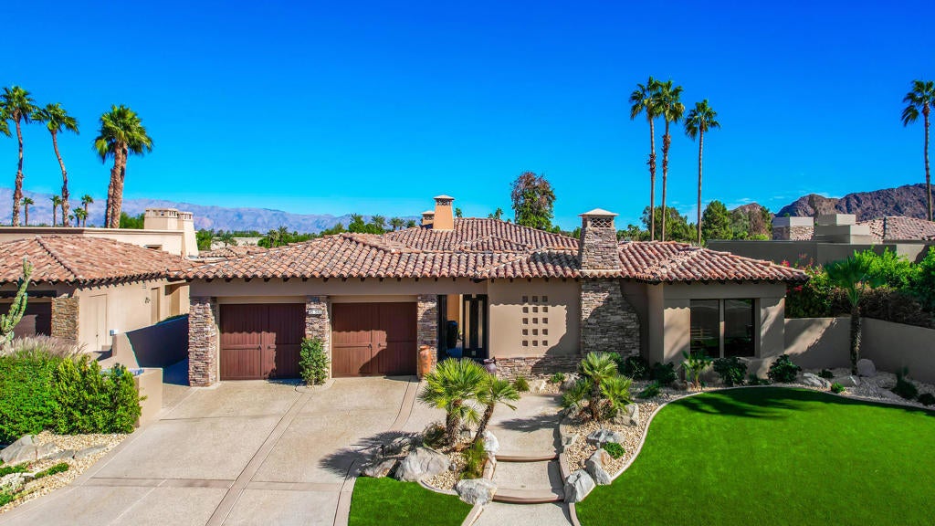 Tuscany style furnished home with magnificent triple fairway, mountain, and lake views located in prestigious community of Villaggio at Indian Wells Country Club. Semi-custom, open floor plan, Guest Casita, 3609 Sq. Ft., 4 Bedrooms carpeted, 4 Bath ensuite, Powder Bath, 3 fireplaces, 2 cars plus golf cart A/C garage. For great entertainment, the home has exceptional east fairway views, covered patios, sparkling pool/ spa and cascading waterfall, bar island with firepit, BBQ island with granite countertops and ample bar seating. New beautiful landscaping, synthetic grass front lawn, spacious gated Courtyard entryway. Enter Great Room with high ceilings, travertine floors throughout, stonecast fireplace, built-in media center, and walls of glass with incredible views. The formal Dining Room adjoins Chef's Kitchen which features granite counters, Viking appliances, wine cooler, 2 kitchen islands, and pantry. Primary Bedroom Suite has stonecast fireplace, direct access to pool/spa, and showcases lovely golf course and mountain views. Primary Bath has granite countertops, dual sinks, jet tub and large shower, dual walk-in closets. One large Guest bedroom serves as home office with built-in custom desk and cabinets. Private entry 700 Sq. Ft. Guest Casita encompasses a living room with granite fireplace, dining room, kitchen area with granite countertop, built-in microwave, bar refrigerator and bedroom suite. Desert lifestyle at its finest!