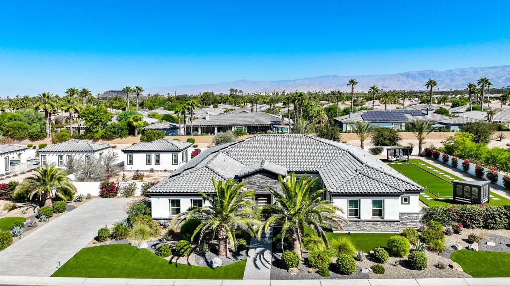 Welcome to 81850 Mountain Spur Dr., in the low HOA community of Rancho Santana. This exceptional home, built in 2022, offers 5 bedrooms, 5.5 bathrooms, offers a seamless flow between indoor and outdoor living. Incredible details include owned Solar, approx 30 panels), custom office, soaring ceilings, Quartz counters throughout, and 24'' x 48'' tile floors. Enjoy the chef's interactive kitchen with premium GE Monogram appliances, custom cabinetry and a 5 seat island, that is wide open to the dining area and expansive great room, with it's 72'' Direct Vent Fireplace. The large, walk in pantry off the kitchen includes a 6 ft., two zoned wine chiller, and custom pull out cabinets. The bright laundry room is conveniently located off the 3 car air-conditioned, and epoxy floored garage. Triple zoned A/C saves energy. The primary bedroom features a stunning, modern bathroom with dual counter tops, a soak tub, a spa like shower, plus two large walk in closets! Each of the 3 roomy guest bedrooms in the main home, feature an ensuite bathroom, and walk in closet. One of them may act as an attached casita that opens to the front courtyard. Step outside from the great room, to a covered lanai, with built in Cook Station. An over sized saltwater pool, and 7 ft x 7 ft. waterfall spa, capture the Western mountain views. The 2 room, 568 sf detached casita is gorgeous. Professionally landscaped, including a raised herb/flower garden bed, mature palms and a Bocce ball court.
