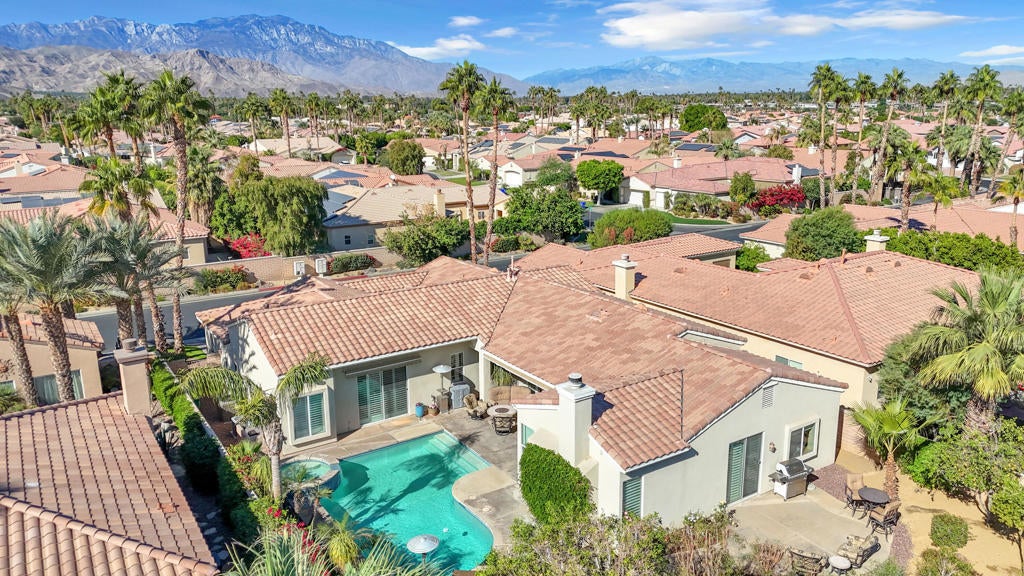 Welcome to the gated community of Lantana in Palm Desert! This is an immaculate, well maintained home that has hardly been lived in. Low HOA fees of $137. The Mediterrean feel starts as you walk into the courtyard, past the fountain, through the double doors and into the spacious entryway. Boasting 3014 square feet of living space including 3 bedrooms, an office/den and a separate dining room with fireplace, as well as a laundry room and 3 car garage.. The gourmet kitchen has a 5 burner gas range, double ovens, granite countertops, a huge island with lots of storage and a step-in pantry. The primary bedroom has an ensuite bathroom with dual vanities, a bathtub overlooking the backyard, a separate enclosed shower, a separate WC and an oversized walk-in closet. The living room, the dining room and the primary bedroom all overlook (and have doors leading to) the pool/spa and back yard. The patio has retractable awnings and lots of flowers and fruit trees as well as gorgeous mountain views. Walking distance to Palm Desert High School, Palm Desert Charter Middle School and Sacred Heart. Close to shops and restaurants, including El Paseo and the mall.