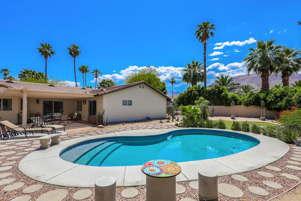 Discover this beautiful Palm Desert pool home built on .31 acres in 2002 with Magnificent mountain views and Stellar location!! Rare 4 bedroom, 2 Full bath home with open floor plan, high ceilings, cozy fireplace, tile floors and numerous upgrades including an oversized two car garage with Tesla charger! Close proximity to Trader Joes, Whole Foods, restaurants, College of the Desert and the McCallum Theatre! Nice Kitchen with granite countertops, center island and newer appliances. Both bathrooms upgraded with fully tiled showers, soaking tub and granite countertops. Upgraded laundry room with newer washer/dryer. Your own private oasis for true indoor/ outdoor entertaining. Newer heated, salt water pool with Pentair equipment. Covered patio, 3 hole putting green, established landscaping with new drip irrigation and in ground lighting, mature trees. Energy efficient home, reroofed in 2020, newer air conditioner. New carpet has been installed in the living room area and primary bedroom. The exterior & interior home has been freshly painted. No HOA!! Don't hesitate, call today to tour this Beautiful property!