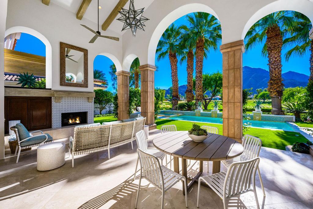 A One-of-a-Kind Masterpiece in La Quinta! Designed by renowned interior designer Ashley Whittaker, this exceptional home has been meticulously transformed, with every detail thoughtfully curated. From creative wallpaper choices to stunning stonework and new top-of-the-line appliances, no surface has been left untouched. The expansive open great room features a custom sit-down bar, formal dining area, and a gourmet kitchen with a center island and dining nook--perfect for both everyday living and entertaining. The space flows seamlessly through pocket doors to an outdoor loggia with soaring ceilings, a cozy fireplace, and an inviting outdoor living room. Enjoy breathtaking views of the south-facing mountains while overlooking the 4th fairway at Tradition --a true golfer's paradise and an unparalleled backdrop for everyday living. Step outside to your private resort-style oasis: a custom pool and spa with cascading waterfalls, a built-in BBQ center, and a stylish fire pit. The spacious primary suite offers a tranquil retreat with custom fireplace, while the spa-inspired bathroom boasts a soaking tub, dual vanities, a luxurious walk-in shower, and dual closets. A cozy office with custom built-ins overlooks a serene courtyard fountain - the perfect space for productivity or relaxation. Guests will be pampered with two additional suites, each featuring ensuite bathrooms, plus a detached Casita offering a living room, bedroom, and ensuite bath for added comfort. Offered Unfurnished.