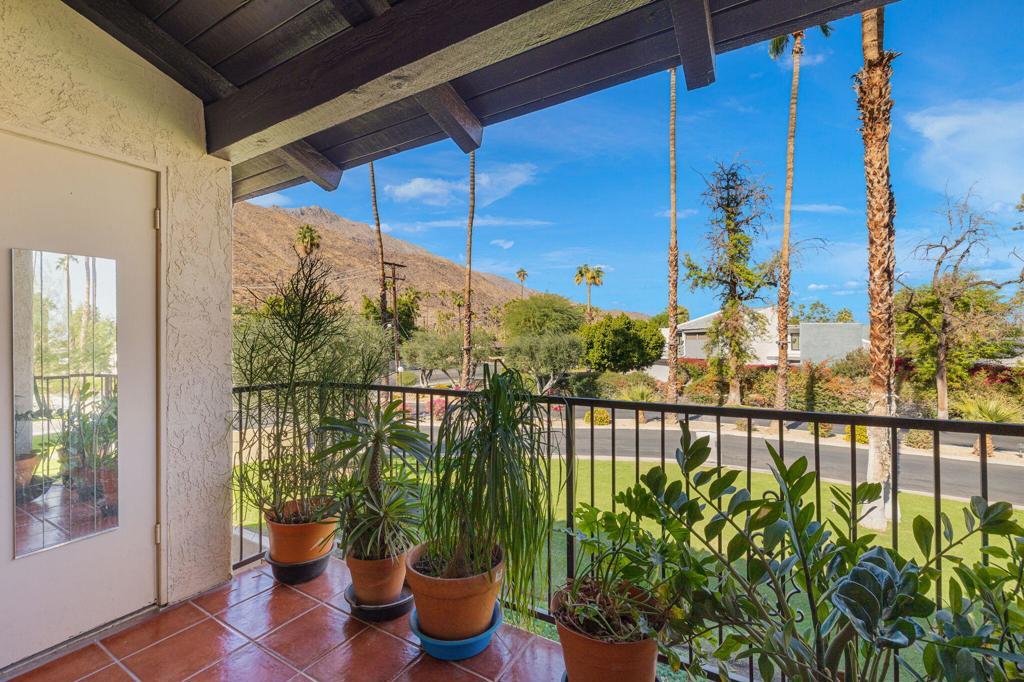This upper-level condo is in a very desirable location out of the wind and close to dining and entertainment. The complex is meticulously maintained. The complex amenities include tennis and pickleball courts, and pool and spa areas. The active clubhouse includes kitchen, billiard room, sauna, fitness center, Ping-Pong, and game room. This low-density complex features covered assigned parking, and is close to guest parking. The complex is low density with 120 units covering 14 acres. These spacious condos in the Canyon Country Club Estados rarely become available. Extensive hiking trails in the Palm Springs area are just close by. Located minutes from downtown Palm Springs, with world class shopping and dining. The balcony is private and features a storage closet. The interior features high vaulted ceilings which allow for expansive wall space. Newer cabinets in the kitchen and bath. Newer counter in the bath. All tile flooring except for the bedroom, which has newer carpet with cork padding. Decorated in warm neutral colors. Furnishings available. Newer water heater and some electrical upgrades.