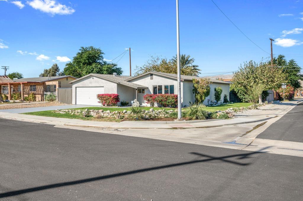 Great opportunity to own this Move-In Ready total newly fully permitted remodel 4 bedroom, 2 bath home on the corner oversized lot with plenty of room for kid playground, pool and spa, ADU, or RV parking . Located on a corner large front yard for a lemon stand or side gate for RV with no HOA's, no Mello Roos, and no short term rental restrictions. The thoughtful and designer material selections 2024 updates include a contemporary kitchen with custom engineered stone countertops, all new stainless steel appliances, and new bathrooms, along with new premium windows and padded luxury vinyl planks throughout. Step into an expansive patio creating a serene backyard for relaxation, family gatherings and entertaining. The backyard offers a private fully fence and perfect safe environment for kids playground where you can relax beneath the shade of a very large tree and mature citrus trees. The tastefully landscaped front yard offers a tranquil area to soak up the home's natural elements all set against the backdrop of Indio's breathtaking scenery. Premium features include an air conditioning and heating system, new ducts, new recessed canned lighting, new smart thermostat, new alarm system, new stucco color coat, new electrical panel, new whole house wiring, new chandelier, and outlets and switches. Recent installed Roof and water heater (5 years or less) and overside front yard ready to welcome you home. This home features an open concept living with 4 bed