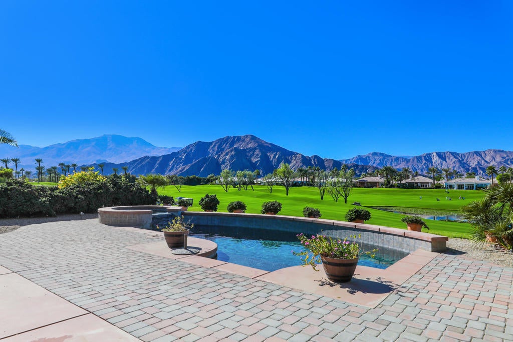 **OPEN 11am-1pm WED 11/20, THUR 11/21, FRI 11/22, SAT 11/23 COME SEE!** This Camina's private courtyard leads to the covered rotunda entry and into the large foyer that opens to the bedroom wing, the Dining Room (or office or bedroom), and the columned entry to the Great Room with its soffited ceiling, corner fireplace, circular wet bar and big outdoor views through its wall of windows.That outdoors features a large, patio that extends to the pavered decking surrounding the sparkling pool and spa, and all wrapped by lush landscaping.The feature list is endless - dramatic 12' soffited ceilings, 8' doors, gourmet kitchen with slab granite counters, convection oven and built-in refrigerator; Roman tub and separate shower in master bath, switch-start fireplace, etc, etc, etc.Mountain View Country Club is crowned by the Arnold Palmer Signature Course and wrapped by the Santa Rosa Mountains. The 24,000 sf. newly remodeled clubhouse hosts a wide variety of social events and offers multiple dining areas and lounges. The 7,000 square foot fitness & aquatic center incorporates state-of-the-art equipment, an aerobics and Pilates room. The showers, saunas, steam rooms, and whirlpool complement the day spa with its extensive menu of massages and facials. Outside facilities include tennis courts, pickle ball, bocce ball and a resort-style pool. Experience the height of resort-style living in this extraordinary community- it's more than a residence; it's a lifestyle waiting for you