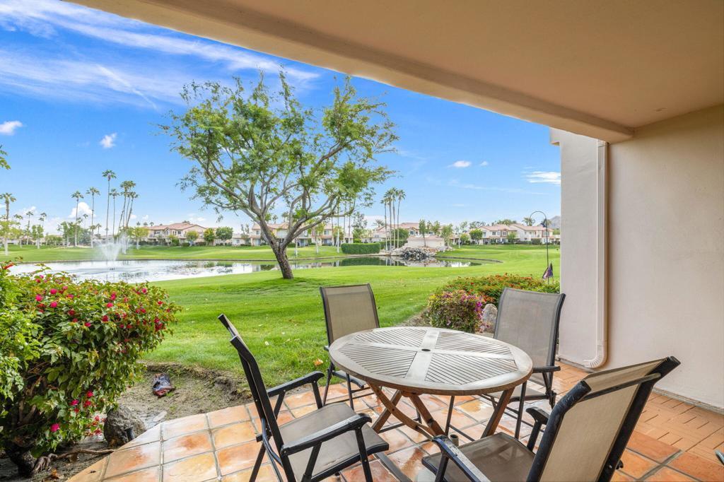 Enjoy fantastic lake, fairway and mountain views from the patio of this ground floor golf course condo. This property has been extensively remodeled. The kitchen features newer cabinetry, appliances, and slab granite counters. Bath has a custom tile walk in shower, newer vanity, and granite counter. All tile floors. Turnkey furnished per inventory. Decorated in warm, neutral colors. Interior laundry. Located close to the community pool / spa and tennis and pickleball courts. Close to the clubhouse. The inclusion of a 1-car garage adds practicality to the package. The complex's amenities include 6 community pools and spa areas, to provide ample opportunities for relaxation and recreation. The added perk of UNLIMITED golf on a Ted Robinson designed par 3 course. Featuring tennis and pickleball courts that are well maintained. Now the area headquarters for Helix Disc Golf, enhances the lifestyle appeal. Low HOA dues covering essential services, cable, and internet make for worry-free living, while convenient access to shopping, dining, and transportation adds to the property's allure. Situated across from the Indian Wells Tennis Gardens, home of the Paribas Open, this property is perfect for either full-time residence or a luxury seasonal home. Overall, it truly offers a lifestyle of convenience and luxury.