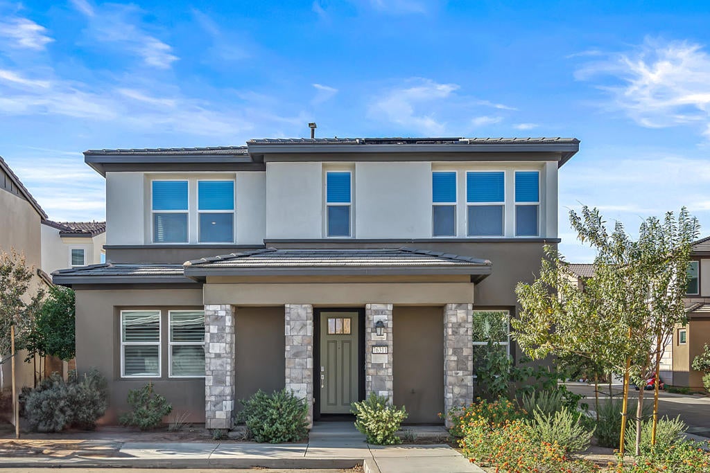 This contemporary, solar-owned Lennar home showcases an open floor plan that integrates the living and kitchen areas, complemented by custom window coverings, shaker cabinetry, quartz countertops, and tile flooring. Featuring a convenient main-floor bedroom and full bathroom, this gently used home offers a clean and fresh palette. There are three additional bedrooms upstairs, including a spacious owner's suite with a walk-in closet. Community amenities offer a recreation facility, pool and spa, BBQ area, and a cozy fire pit. Ideally situated near Acrisure Arena, golf courses, schools, and a variety of dining options, this lovely home is in a prime location.