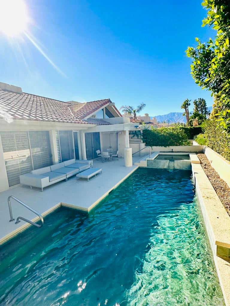 The architecture of this 2 bed 2.5 bath condo is hard to find and very desirable. Step in and immediately notice the grand vaulted ceilings and striking exposed wood beams. Celestial windows bring in lots of bright natural light perfect for winters in the desert. A mid-century fireplace and walk-up bar create a cool look and cozy feel. Desirable plantation shutters throughout create charm and privacy when needed. Additional convenience is a separate laundry room and dual air conditioners for the main house, plus a dedicated air conditioner in the 2-car plus golf cart garage. Outdoors, you'll find a private pebble pool and elevated spa, and easy maintenance cool decking surrounding the pool, perfect for relaxing or entertaining. This north-facing home is perfectly situated facing deep green space, and peek-a-boo views of the San Jacinto Mountain peaks, providing serene views. Don't miss out on this opportunity to own in a prime location, near Eisenhower, restaurants and shops, and across from the new Disney Cotino development.