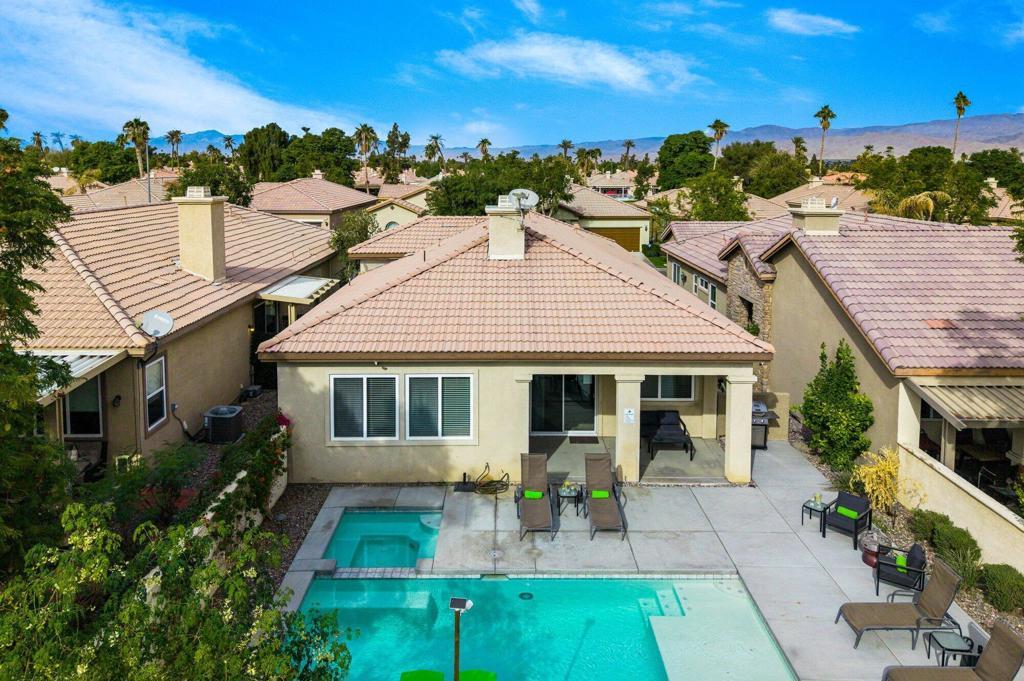 Welcome to Indian Palms Country Club in beautiful Indio, where resort-style living meets relaxation & convenience. This home is situated in a vibrant community featuring a 27-hole championship golf course, offering three unique nine-hole courses--Mountain, Royal, & Indian Nines. Enjoy dining at the 'Hangar 19' restaurant, hosting special events, or taking advantage of the lifestyle center & tennis courts for recreation & wellness. This charming 2-bedroom, 2-bathroom home is designed for easy living at its finest. The open-concept living and dining areas are perfect for entertaining, featuring a large center island with gorgeous views of the mountains, pool, & spa. Natural light pours into the home, and the neutral paint palette enhances the calming atmosphere of a desert resort lifestyle. The primary suite offers a spacious retreat with a double vanity, a large soaking tub, a walk-in shower, & an expansive walk-in closet for all your storage needs. The second bedroom & bathroom are thoughtfully designed with high ceilings, making the home both roomy and cozy at once. The oversized garage, complete with golf cart parking, provides plenty of space for storage or your desert toys. Whether you're looking for a full-time residence, a vacation retreat, or an investment opportunity, this home delivers with an excellent rental history that can be passed to the new owner. Just minutes from world-class golf, tennis, pickleball, shopping, dining, hiking, biking, & the Acrisure Arena.
