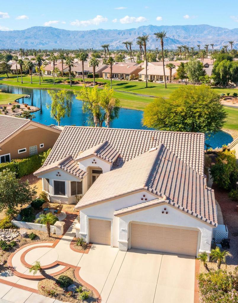 GORGEOUS GOLF COURSE, LAKE & MOUNTIAN VIEWS. Located in the beautiful 55 plus Del Webb Sun City Community on the 17th hole of the San Gorgonio course. This St Croix model is complete with 2 bedrooms, 2 baths, den & office with lots of beautiful upgrades. The stunning, large eat in kitchen has new granite, beautiful backsplash & newer appliances with a breakfast bar. With an open floor plan the living room has built in shelves & great views out to the golf course & lake. The primary bedroom is expansive with a door out to the patio & the bathroom suite is nicely upgraded. The office space includes built in shelves & desk with beautiful brazilian koa wood floors extended out into the den. Newer tile floors throughout the rest of the home, with carpet in the bedrooms. The laundry room includes sink & cabinets, 2 car garage with golf cart garage with new garage doors. Newer A/C, water softening system. Exterior of homes has new brick inlay & cool concrete added recently. Home is equipped with speakers through out the home, patio & garage. Fruit trees & water feature in front of the home along with a front patio to sip your morning coffee & enjoy watching the sunrise. This home has all you need within a community filled with amenities.