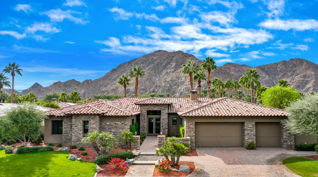 Welcome to this outstanding designer furnished, Tuscany inspired, semi-custom home built by renowned Ministrelli within exclusive Villaggio community at Indian Wells Country Club. Beautiful pavered driveway and walkways into courtyard entry of this gorgeous 3749 Sq. Ft. home, 4 bedrooms, 4 baths ensuite, plus Powder bath, home office, and 3 car garage. South facing home features new landscaping, large pebble tech pool/spa, mountain views, covered patio with built-in BBQ island, wonderful for entertaining! Open floor plan, high ceilings, Versailles pattern travertine floors throughout, stone baseboards and neutral carpets in bedrooms, Great Room and Dining Room. Great Room with pool and mountain views has built-in custom media center. Formal Dining has wet bar and serving area with granite countertops. Gourmet Kitchen has stainless Wolf appliances, Sub-zero refrigerator, 6 burners with grill stovetop, beautiful granite countertops and full backsplash, large island with bar seating and pantry. The Family Room adjoins the Kitchen with stonecast fireplace and custom built-ins. Private Primary Bedroom Suite features beautiful views, steps away from the sparkling pool/spa. Elegant Primary Bath has two walk-in closets, dual vanities, marble countertops, large glass shower, and jet tub.. Desert Living at its finest! Low HOA.