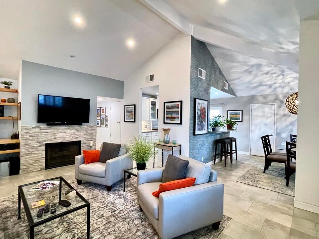 Welcome to your beautifully renovated home in the gated serene Sunshine Villas community, designed by renowned architect Hugh Kaptur, which has lush greenbelts, breathtaking mountain views, and more than 450 trees! This stylish single-level condo offers an open floor plan, vaulted ceilings, and abundant natural light. The remodeled interior features a modern kitchen with custom quartz countertops and stainless-steel appliances, updated bathrooms, new tile flooring, recessed lighting, a cozy gas fireplace, and energy-efficient Milgard windows and doors. Two private patios provide ideal spaces for relaxation or entertaining, and an attached 1-car garage adds convenience. A transferable home warranty provides platinum coverage through 2/2030. Sunshine Villas offers incredible amenities, including 4 pools and spas, tennis courts, a pickleball court, a new dog park, and direct access to hiking and biking paths in the adjacent Prescott Reserve. Monthly HOA fees include Spectrum's digital cable TV and high-speed internet service, water and trash collection services, and funding for the community's new desert landscaping project. Ideally located near shopping, dining, nightlife, and the airport, this home is your gateway to effortless Palm Springs living! All furnishings are available for purchase outside of escrow.