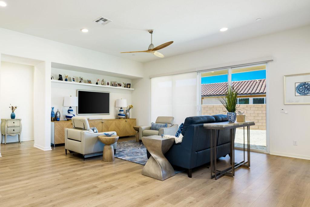 Discover the epitome of modern living in this meticulously designed Capistrano at LQ single-family residence, built in 2023, with west-facing mountain views. Nestled on a spacious 10,803 sq. ft. cul-de-sac lot, this home boasts an OWNED-SOLAR system valued at $28K with electric costs averaging $59 monthly. Belgrave paved front courtyard. Spanning 2,348 sq. ft. of open-concept living, it features three bedrooms, 3.5 bathrooms, and high-end finishes, including vinyl plank flooring, upgraded carpet in the bedrooms, and contemporary Fanimation and Kichler ceiling fans. Thoughtful upgrades include custom Hunter Douglas pleated blinds, motorized solar shades, and a Smart Home system with ADP security, Sonos sound, and a custom TV/media niche. The versatile den/office/4th bedroom offers built-in cabinetry, a quartz countertop, a wine fridge, and a queen-size Murphy bed. The chef's kitchen is a culinary dream, equipped with stainless steel appliances, dual ovens, a 5-burner cooktop, a Samsung Smart refrigerator (plus a second fridge in the garage), quartz countertops, a prep island with bar seating, under-cabinet lighting, and a stylish subway tile backsplash. Guest accommodations include en-suite bathrooms, while the primary suite offers dual sinks, a vanity, a walk-in closet, and a glass-enclosed shower. The expansive rear yard is a blank canvas for your landscaping vision, complemented by a covered patio with Hinkley outdoor lighting.