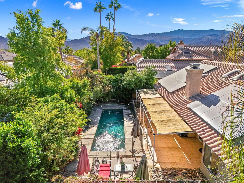 Welcome to Easy St, a charming cul-de-sac located within the community of Sandcastle Homes in Palm Desert. This 3-bedroom, 2-bathroom home features OWNED solar panels, offering substantial energy savings and offsetting the current owner's electric bill. Inside, you'll find a spacious living room, a den, a formal dining area, and a kitchen equipped with stainless steel appliances. The living room boasts a picturesque window with stunning views of the mountains and beautiful desert sunsets. Both bathrooms have been remodeled in recent years. The backyard is a private oasis with a large pebble tec pool, new pool pump, and a security fence. The recently redone backyard awning provides shade over the sizeable patio. Additionally, the separate laundry room comes with a new washer and dryer. Sandcastle Homes is nestled in the picturesque city of Palm Desert, providing quick access to world-class golf courses, upscale shopping, fine dining, and cultural attractions. Don't miss this opportunity to own a piece of Palm Desert paradise with the added advantage of NO HOA dues.